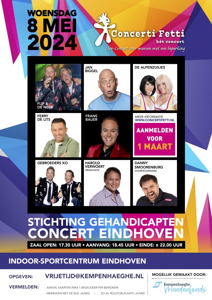 Op 8 mei 2024 vond Concerti Fetti plaats in het Indoor Sport Centrum Eindhoven: een bijzonder liveconcert speciaal georganiseerd voor mensen met een beperking. In totaal waren er 115 aanmeldingen, inclusief de begeleiders. Het werd een feestelijke dag met optredens van grote namen zoals Flip en De Nees, Jan Biggel, De Alpenzusjes, Ferry de Lits, Frans Bauer, Gebroeders Ko en Danny Smoorenburg, terwijl Harold Verwoert de presentatie op zich nam. Dankzij de steun van het Vriendenfonds konden er drie touringcars worden ingezet, waardoor alle bezoekers comfortabel naar het concert konden reizen. Het evenement bracht muziek, plezier en verbondenheid samen in een onvergetelijke sfeer.